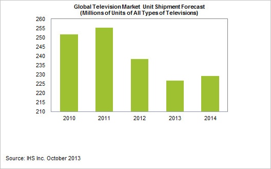 Research firm IHS has updated its forecast for 2013 global TV shipments, now predicting a decline of 5% for the full year. This would be the second consecutive down year, following a 7% falloff in 2012 (I'm confirming whether this is the first time IHS has ever seen consecutive year declines. UPDATE: IHS has confirmed this is the first-ever 2 year consecutive decline). Shipments for 2013 are now estimated at 226.7 million units. IHS believes 2014 shipments will increase by just 1% in 2014 to 229 million units.